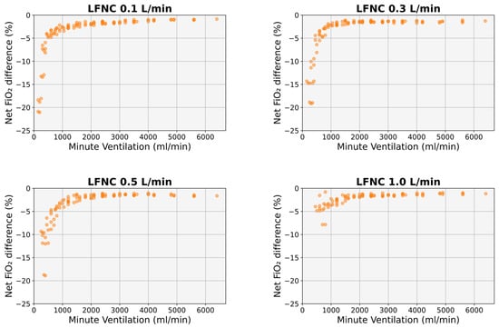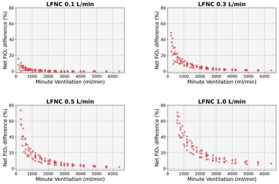 Figure 6. Difference between the FiO2 calculated using Finer’s formula [4] and the simulated FiO2 for the same MV. LFNC: low-flow nasal cannula, MV: minute ventilation.