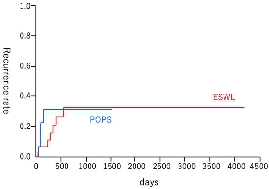 After successful treatment, the stone recurrence rate was 26% (4/15), with a median observation period of 176 days (range: 0–1507 days) in the POPS group and 24% (8/33), with a median observation period of 329 days (range: 0–4171 days) in the ESWL group (p = 1.00) (Table 5). The cumulative recurrence rates did not show a significant difference (log-rank test, p = 0.53) (Figure 2). Additionally, a Gray test was conducted to reduce the impact of death events that could act as competing risks for recurrent pancreatic stones. However, no significant difference was observed between the two groups (p = 0.668). Among the four patients with recurrence in the POPS group, two remained asymptomatic and required no additional treatment, one underwent endoscopic stone removal, and one required additional EHL. Among the eight patients with recurrence in the ESWL group, all the patients underwent repeat ESWL and endoscopic treatment.