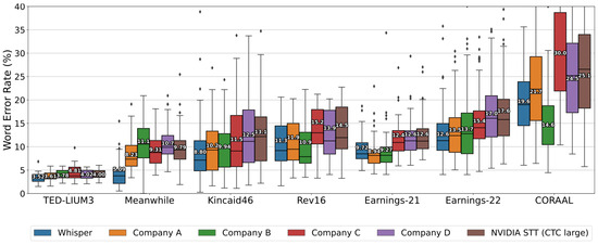 Comparative performance of the Whisper model in long-form transcription against leading ASR systems [26].