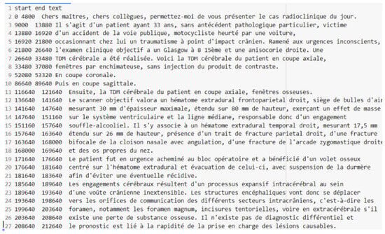 Figure 1 offers a visual summary of the Whisper Large-v2 model’s Word Error Rates (WERs) juxtaposed with those of other prominent ASR systems. It depicts a boxplot distribution for each system, which includes the median WER and the interquartile ranges, thereby furnishing a statistical comparison of the performance metrics. The selection of the Whisper model was substantiated by this extensive assessment, affirming its capacity to outperform the well-established NVIDIA STT model across diverse datasets and to maintain competitive accuracy alongside proprietary ASR systems. The entire dataset was transcribed using the Whisper Large-v2 model, developed by OpenAI, due to its proficiency in handling diverse audio environments and its flexibility in processing extensive inputs. This model processes audio in segments of 2 to 30 s, generating detailed transcriptions for each, which are then combined to form the transcription for the entire audio file. Upon transcription, the Whisper model generates a TSV file for each audio recording. This file details the start and end times of each sound segment and its corresponding transcription, ensuring a precise match between audio and text. The “start” and “end” columns within the TSV file demarcate the commencement and conclusion of each sequence, offering a precise temporal framework for the segmentation of both audio files and their transcriptions, as illustrated in Figure 2.