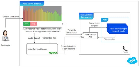 The deployment of the “WhisperMed Radiology Transcriber”, a specialized speech recognition application tailored for radiologists, involved configuring a server environment on Amazon Web Services (AWS). Flask was utilized for back-end management, while Nginx facilitated front-end integration, as depicted in Figure 4. The architecture of this application supports audio recording through a web interface, processes the recordings on a remote server, and displays transcriptions in real-time. Designed with an emphasis on real-time transcription and an intuitive user interface, the “WhisperMed Radiology Transcriber” aims to meet the precise needs of medical professionals within French-speaking clinical settings.