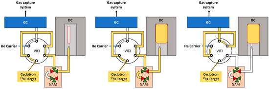 Connections and valve positions for capturing and testing [15O]O2 gas. LEFT: with the six-port valve (VICI) in position A, gas flows along the yellow pathway through the short sampling loop, through the three-way solenoid valve, and into a bag to capture the gas for dose calibration (DC). MIDDLE: the solenoids were activated and the [15O]O2 gas is trapped in the DC and sampling loop. RIGHT: while the gas is trapped in the DC, the VICI valve is actuated to position B and helium (He) carrier empties the small sample of gas onto the gas chromatograph (GC) for analysis. NAM = in-house designation for solenoid device [10].