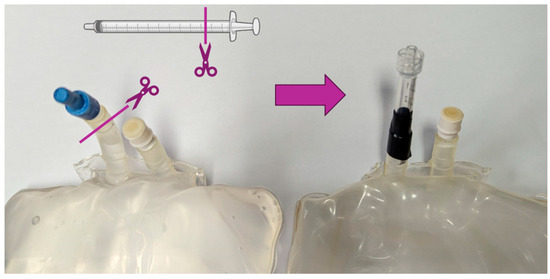 Adapting a 1 L sterile water bag to act as a gas capture bag for dose calibration of [15O]O2. Cuts are indicated for the syringe and bag with the produced gas capture bag to the right of the arrow. Using electrical tape, the bag could be pressurized and was gas tight.
