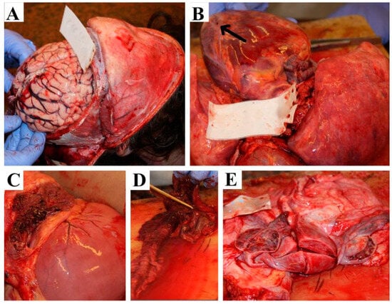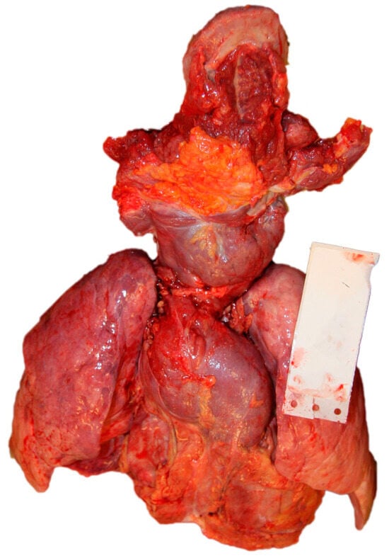 A forensic autopsy was performed according to the Recommendation No.R (99)3 of the Council of Europe []. During the external examination, apart from the swollen thyroid region (goiter), no physical alterations or injuries were found on the body—not even the external signs of hyperthyroidism (such as proptosis, thyroid dermopathy, or acropachy) []. The victim was 167 cm in length and weighed 62.8 kg (BMI: 22.5). Cerebral hemispheres showed generalized edema without any macroscopically visible focal pathology. (Figure 1A). The thyroid gland was enlarged, with a size of 8 × 4 cm on both sides. A pedunculated tumor with 2 cm diameter was found at the lower pole of the right lobe. The cut surface of the thyroid gland was normal. (Figure 1B). The thymus was enlarged at 7 × 7 × 2 cm in size. Macroscopically, the thymus and the thyroid gland were attached to each other. The right ventricle of the heart was dilated, and petechial hemorrhages were found on the epicardium (Figure 1B). During the autopsy of the heart, the coronaries and the chambers of the heart were opened using transversal cuts []. The left ventricle wall thickness measured at mid-cavity level was 11 mm, with a septum thickness of 12 mm, and the right ventricle thickness was 2 mm at the same level. No pathological condition was found in the heart apart from the above-mentioned epicardial petechial bleedings, and the coronaries were free from atherosclerosis or thrombosis. The lungs were slightly overinflated, but no other macroscopically visible alteration was observed. The cut surfaces were dry, and no fluid could be pressed out. No emboli were found in the first and secondary branches of the pulmonary arteries. The spleen was macroscopically hypovolemic. A focal parenchymal hemorrhage was observed in the parenchyma (Figure 1C), and also mucosal bleeding was seen in the proximal part of the small intestine with focally blood-stained content (Figure 1D). The ovaries were normal-sized, but multiple cysts of 0.5 cm could be seen, filled with blackish–red content (Figure 1E). Examination of the superficial and deep veins of the lower extremities revealed no presence of thrombosis, similar to the examination of the venous system of the small pelvis. Figure 2 illustrates the neck-lung-heart complex (Figure 2).