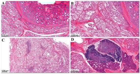 Histological findings of thyroid gland (HE staining). (A,B) normo-, micro- and macrofollicules in fibrotic capsule, (C) lymphoid infiltrates in the stroma, (D) attachment of thyroid gland and thymus.