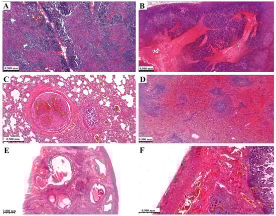 Histological findings (HE staining). (A) Thymus, (B) pancreas, (C) lung (thrombus), (D) spleen, (E) ovarium, (F) small intestine.
