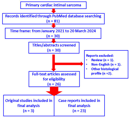 We searched the PubMed database for the most recent full-length, English publications from January 2021 to 20 March 2024 and only included original articles in terms of studies and case reports with respect to the diagnosis of “primary cardiac intimal sarcoma”. No other histological types of cardiac tumours were analysed. We identified 81 papers from inception to the present time and searched the most recent 30 papers according to the mentioned time frame of publication. Finally, after manually checking each of these articles, 26 papers were selected (one article was excluded because it was not written in the English language, another was a review, and the other two introduced other histological types than intimal sarcoma) (Figure 1).