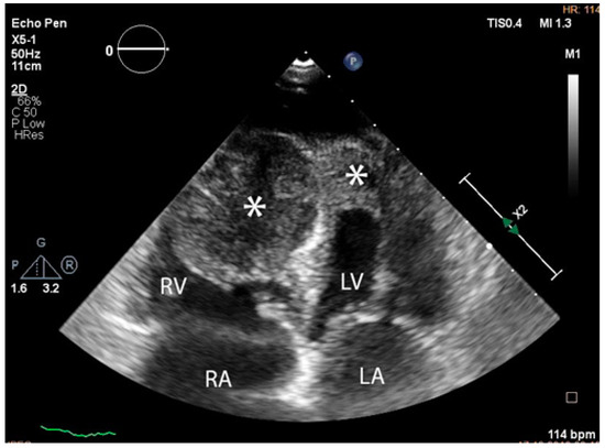 Transthoracic echocardiographic apical four-chamber view: a larger mass (∗) in the right ventricle which also involves the apex of the left ventricle. (Abbreviations: RA = right atrium, LA = left atrium, RV = right ventricle, LV = left ventricle, (∗) cardiac mass.)
