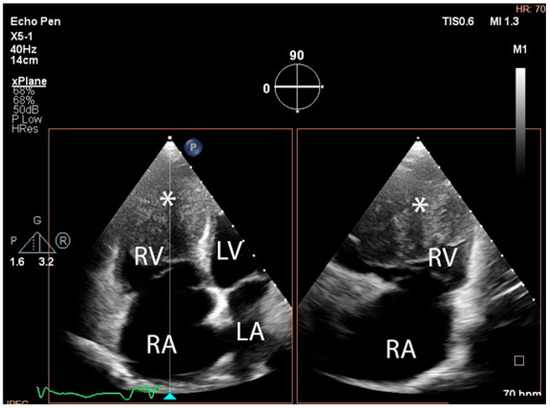 Transthoracic echocardiographic, biplane view of the right ventricle; note the mass (∗) that displaces a significant part of the cavity. (Abbreviations: RA = right atrium, LA = left atrium, RV = right ventricle, LV = left ventricle, (∗) cardiac mass.)