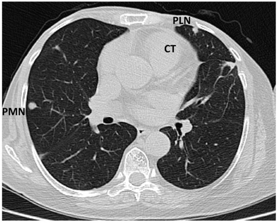 Computed tomography scan: sub-pleural peripheral nodular lesions typical of tumours (abbreviations: CT = cardiac tumour, PLN = pleural nodule, PMN = pulmonary nodule).
