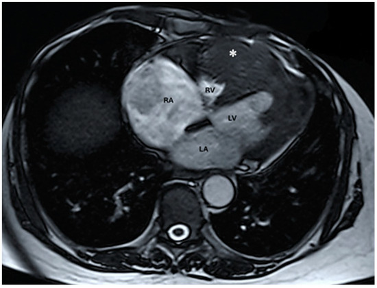 Native magnetic resonance imaging showing parietal thickening at the level of the left ventricle with discreet T2 hyper signal (abbreviations: RA = right atrium, LA = left atrium, RV = right ventricle, LV = left ventricle, (∗) cardiac mass).