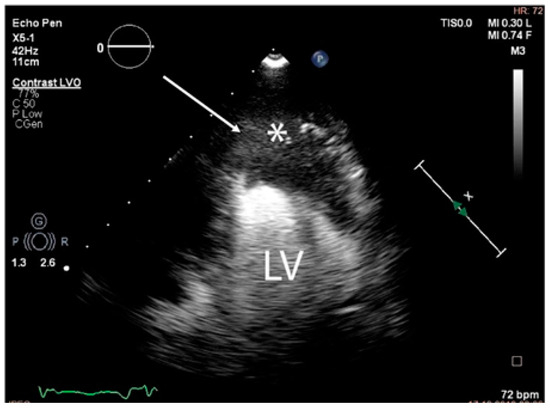 The trajectory (arrow) of the ultrasound-guided puncture at the level of the apex of the heart (abbreviations: LV = left ventricle, (∗) cardiac mass).
