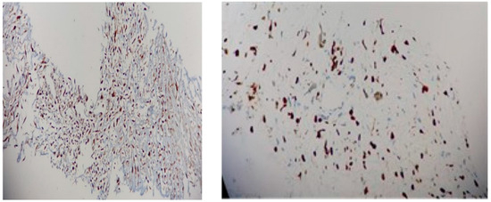 In this case, histological examination revealed an intimal sarcoma with areas of myxoid differentiation and epithelioid-appearing cells. The MDM2 (immunohistochemistry-based) tumour marker is considered to be useful for high-grade intimal sarcomas nowadays. MDM2 (an oncogene that is responsible for blocking the activity of p53) is defined by nuclear overexpression and amplification of the 12q12–15 area, which contains CDK4 (cyclin-dependent kinase inhibitor 2A) and MDM2 [17,18], the MDM2 amplification supporting the diagnosis of intimal sarcoma [17]. Additionally, the intimal sarcoma with a positive stain for MDM2 has been shown by some studies to be associated with a poor prognosis, with a median survival of three to twelve months [17,18]. In contrast, Cho et al. [25] showed that MDM2-positive show a better outcome than MDM2-negative tumours [25]. One more clue of the expected dramatic outcome is the increased value of the Ki67 proliferation marker at immunohistochemistry analysis, as seen in the present case (20% to 80% depending on tumour area), which is similar to other reports of different sarcomas such as osteosarcomas or leiomyosarcomas [17,18,79,80].