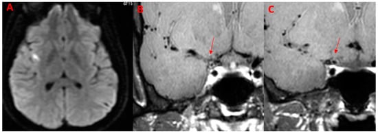 Patient (M/32) with acute onset of headache, dysarthria, and left arm weakness. The diagnosis was PCNSV. (A) Axial DWI image shows a right insular hyperintense area with restricted diffusion. (B,C) Coronal BB T1w VWI after administration of the contrast agent shows an intense, concentric wall enhancement (arrows) of the right sovraclinoideal internal carotid.