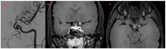 Our study may confirm the importance of including central nervous system vasculitis in the differential diagnoses of multiple, metachronous ischemic lesions in multiple arterial territories [32,33], suggesting the occurrence of micro-embolization or hypoperfusion in association with the inflammation of the vessel wall as a pathophysiological mechanism of the patient’s symptoms. In post-contrast T1-weighted images, no patients presented meningeal enhancement. The presence of leptomeningeal enhancement has been described in up to 40% of cases in different case series [13]; however, due to the lack of post-contrast FLAIR in the acquisition, we cannot exclude by certainty the presence of this additional finding.