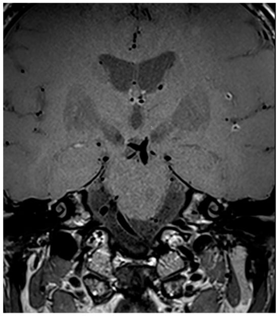 Regarding the sites of alterations, in one patient (33.3%) only the anterior circulation was involved, in one patient (33.3%) only the posterior circulation was involved, and in one (33.3%) both the anterior and posterior circulations were involved. An instance of intense, regular, concentric contrast enhancement of the walls of the basilar artery (BA) is displayed in Figure 5. In post-contrast HR-VW-MRI images, five patients (71.4%) presented alterations in multiple sites (Figure 7).