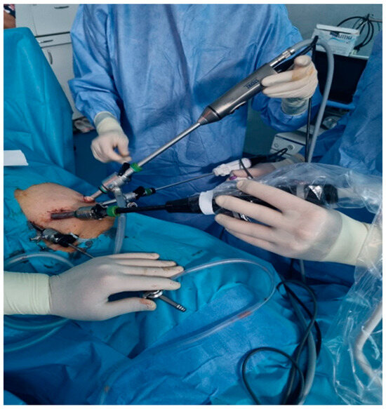 For intraoperative ultrasound procedures, a Hitachi L44LA ARIETTA 60 diagnostic unit with a linear LUS-type IPX7 range probe was utilized, featuring a frequency of 7.0 MHz. The probe consists of an operating head containing the working handle, which can be adjusted for left or right deflection of the ultrasound area. The probe is equipped with a protective tube that can be inserted through the 12 mm trocar.