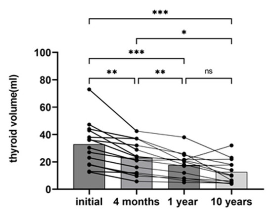 Thyroid volume during follow-up. One-way analysis of variance (ANOVA) parametric test. ***: p < 0.0001, **: p < 0.001, *: p < 0.05, ns: no statistical significance. Columns represent mean values in milliliters.