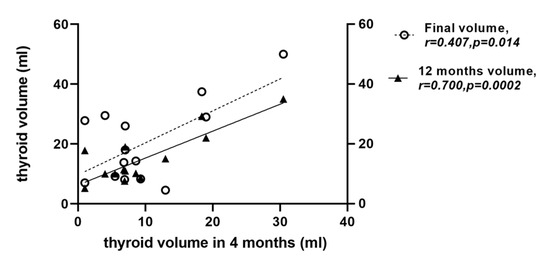The decrease was already significant at the first ultrasound evaluation at 4 months after RAI treatment (Figure 1, Table 2). A further improvement in TV was detected 12 months after RAI treatment; however, no statistical significance was further reached when compared with TV at 4 months after RAI treatment (p = 0.09, Table 2). There was a positive correlation between the decreased thyroid volume observed at 4 months and the volume of the thyroid remnant at the end of the study (r = 0.407, p = 0.014) (Figure 2).