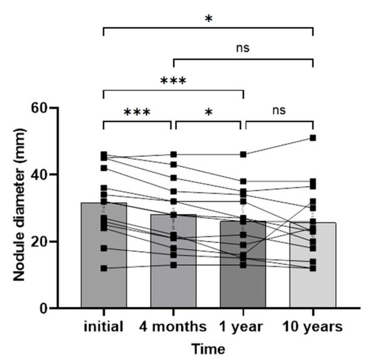 Maximum diameter of the dominant thyroid nodule during follow-up. One-way analysis of variance (ANOVA) parametric test. ***: p < 0.0001, *: p < 0.05, ns: no statistical significance. Columns represent mean values in millimeters.