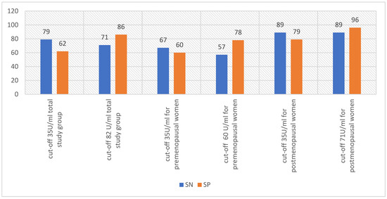 Sensitivity and specificity of CA125 when changing the standard cut-off of 35 U/mL to the cutoff values adopted by the investigators [19]; SN—sensitivity, SP—specificity.