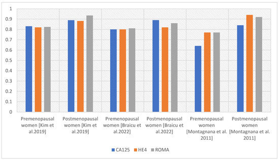 Comparison of AUC values for the parameters CA125, HE4, and ROMA in pre- and postmenopausal women [19,27,30].
