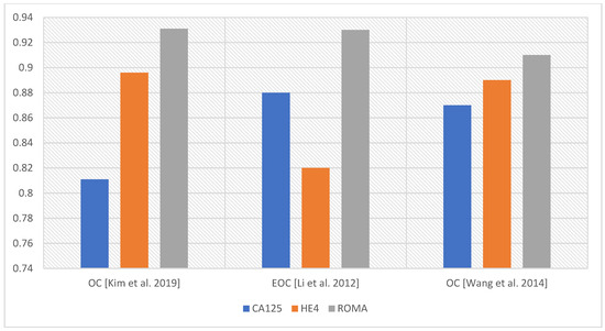 Comparison of AUCs for parameters CA125, HE4, and ROMA [19,28,29].