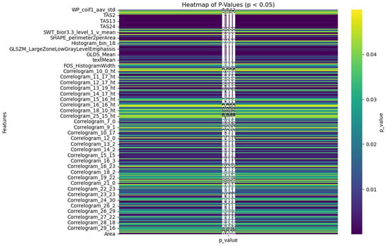 We employed a total of 27 texture and roughness parameters to extract 2484 superficial and spatial features from each image. Within this pool of features, we applied the unpaired t-student tests among all the features. Figure 5 displays a heatmap of p-values less than 0.05 across all the features. Only the features that are significantly different (p < 0.05) were selected in our final model.