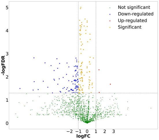 We exhibited the difference distribution of all the selected features. We used volcano plots to assess the significance and magnitude of the differences (Figure 6) as they are particularly effective for visualization. They plot the log2fold change on the x-axis (which shows the magnitude of the change) against the -log10 of the p-value on the y-axis (which indicates the statistical significance of the change). This helps to illustrate both a large magnitude of change and high statistical change. These are usually the most important features.