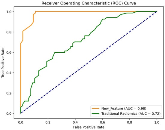 The selected features were fed into the RF classifier and their classification performance was analyzed. Another machine learning model was built using the traditional radiomics feature set. The two models were analyzed by computing several evaluation metrices. The AUC value of the model that was built using the new feature set is 0.98 ± 0.01 which is significantly higher than the AUC value (0.72 ± 0.03) of the model built using the traditional radiomics feature set (p < 0.05). The results are illustrated in Figure 7.