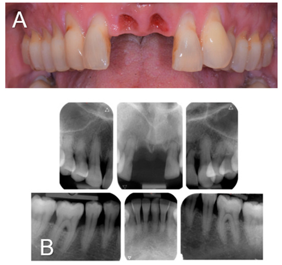 Clinical view (A) and intra-oral radiographs (B) showing the initial clinical status after dental avulsions due to endotracheal intubation as well as the severe chronic periodontal disease.