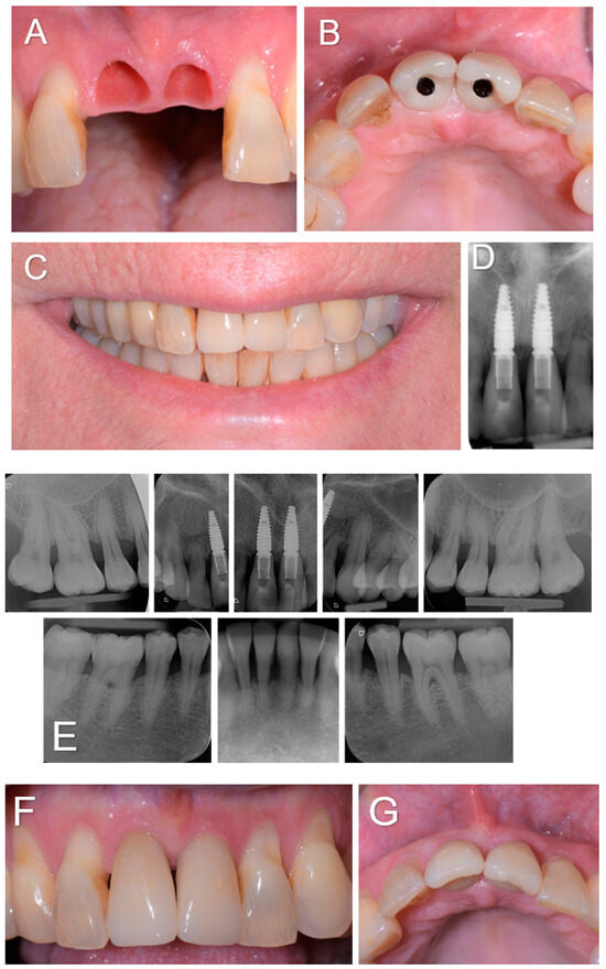 (A–D). Soft tissue condition when the two screw-retained single-unit crowns (E-max. press) were delivered 3 months post-operatively (A,B), and the clinical and radiographic examinations at the 3-year follow-up (C–G).