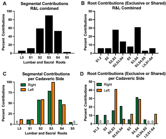 | % root contributions per cadaveric side | 19 right sides: S1—11% S2—58% S3—79% S4—58% S5—5% | 17 left sides: L5—12% S1—12% S2—59% S3—100% S4—47% |