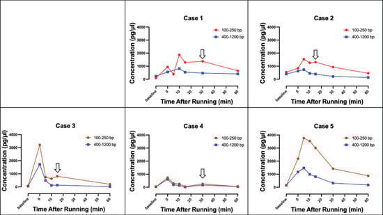 Figure 2 illustrates the time course of changes in cfDNA concentration before and after exercise of each of the study participants, represented by a line graph. Following exercise, the concentration of cfDNA in plasma increased immediately and subsequently declined. The concentration of 100–250 bp fragments consistently exceeded that of 400–1200 bp fragments. Notably, the concentration of 100–250 bp fragments did not exhibit a steady decline; transient increases were observed in cases 1, 2, 3, and 4. This phenomenon was believed to be caused by the breakdown of 400–1200 bp fragments by nucleases, resulting in a brief spike in the concentration of 100–250 bp fragments.