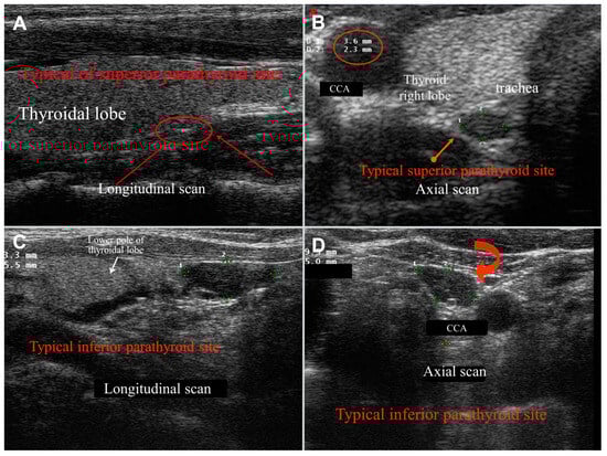 Typical US features and location of superior ((A): normal; (B): adenoma) and inferior ((C): normal; (D): adenoma) parathyroids. Superior glands are usually located posteriorly to the third medium of the thyroid lobes, while inferior ones are normally positioned just inferiorly to the lobe poles. The common carotid artery (CCA) represents an important landmark when exploring the thyroid compartment, and inferior parathyroid glands can be often seen along the CCA sheath (as in (D)). Parathyroid glands usually present hypoechoic structure and oval shape; one or more glands can be defined as enlarged when the longest diameter measures more than 0.6 cm.