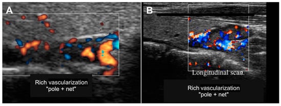 Ecocolor-Doppler US images of parathyroids (white rectangle), showing well-vascularized arterial pole (A) and arterial reticular pattern (B).