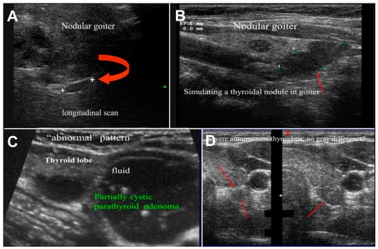 Challenging cases in US imaging. (A) Small parathyroid adenoma (red arrow) in patient with nodular goiter; (B) parathyroid adenoma (red arrow) simulating thyroidal nodule in patient with nodular goiter; (C) partially cystic parathyroid adenoma in patient with colloid-cystic goiter; and (D) parathyroid adenoma in patient with chronic thyroiditis: note isoecogeneity between thyroid and parathyroid gland.