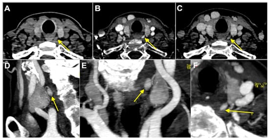 Enlarged left superior parathyroid in 53-year-old woman with primary hyperparathyroidism. Yellow arrow indicates 9 mm soft tissue nodule located posteriorly to third medium of left thyroid lobe, hypodense to thyroid parenchyma on non-contrast-enhanced phase (A), hyper enhancing on arterial phase (B) with subsequent wash-out on delayed phase (C). Reformatted sagittal (D), coronal (E), and axial (F) maximum intensity projection images obtained by arterial phase scan demonstrate upper enlarged polar vessel.
