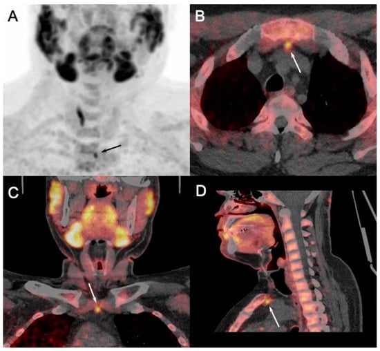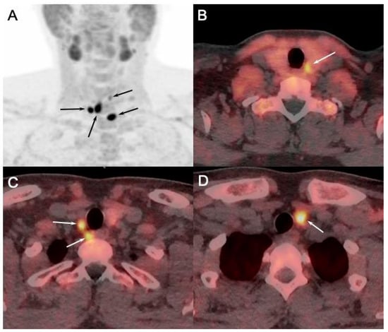 - Talbot, J.-N.; Zhang-Yin, J.; Kerrou, K.; Aveline, C.; Vagne, B.; Bélissant, O.; Tassart, M.; Périé, S.; Bouchard, P.; Christin-Maitre, S.; et al. Multiple endocrine neoplasia type 1 or 4: Detection of hyperfunctioning parathyroid glands with 18F-fluorocholine PET/CT. Illustrative cases and pitfalls. Q. J. Nucl. Med. Mol. Imaging 2022, 66, 130–140. [Google Scholar] [CrossRef] [PubMed]