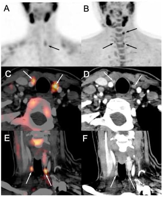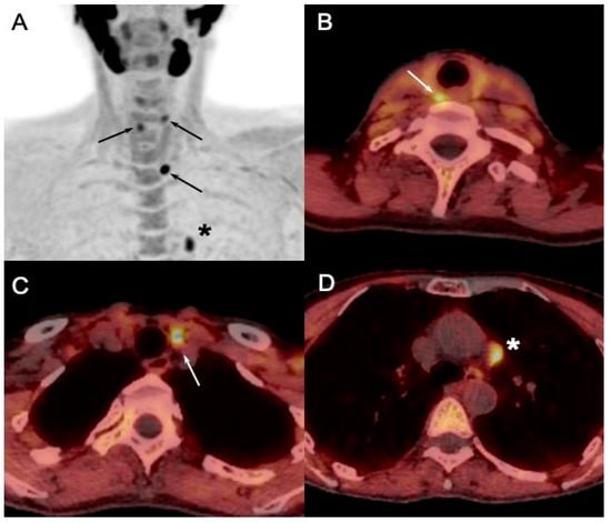 - Cuderman, A.; Senica, K.; Rep, S.; Hocevar, M.; Kocjan, T.; Sever, M.J.; Zaletel, K.; Lezaic, L. 18F-Fluorocholine PET/CT in Primary Hyperparathyroidism: Superior Diagnostic Performance to Conventional Scintigraphic Imaging for Localization of Hyperfunctioning Parathyroid Glands. J. Nucl. Med. 2020, 61, 577–583. [Google Scholar] [CrossRef] [PubMed]