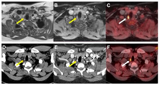 Concordant results of [18F]FCH PET/4D-MRI and [18F]FCH PET/4D-CT (axial slices) in patient with primary hyperparathyroidism showing right inferior parathyroid tumor (arrows) with high [18F]FCH uptake, and early and intense contrast media enhancement ((A): T2-weighted MRI; (B): arterial phase T1-weighted MRI; (C): PET/MRI fusion images; (D): no contrast media enhanced CT; (E): contrast media enhanced CT (arterial phase); (F): PET/CT fusion images). Parathyroid adenoma confirmed after surgery.