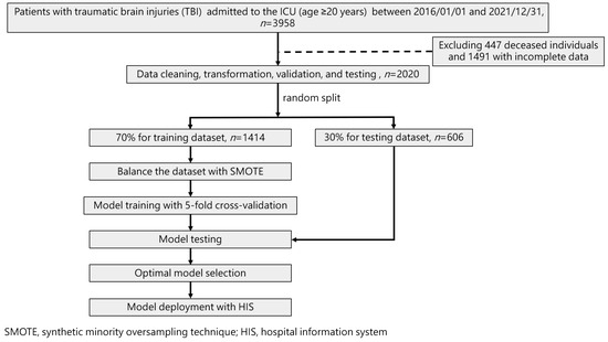 This study retrospectively enrolled 3958 patients aged 20 and above with Traumatic Brain Injury (TBI). These individuals were admitted to the Intensive Care Unit (ICU) at Chi Mei Medical Center in Tainan, Taiwan, between 1 January 2016 and 31 December 2021. The electronic medical records were screened using the following diagnostic codes: ICD-9: 800*–804*, 850*–854*, 959.0, 959.01, 959.8–959.9, ICD-10: S00*–T07*. Primary outcome is defined as “admitted to long-term care center excluding death”. Data with missing values, extreme outliers, and those who had deceased were also excluded (1938 patients).