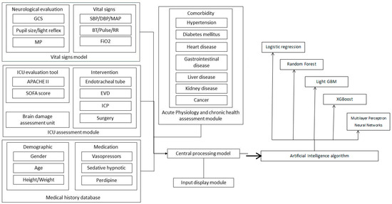 Several studies have identified a range of predictive factors that may significantly influence the outcomes of individuals with TBI in both acute and chronic stages. These factors include age [8,9], sex [9,10], obesity [11], Glasgow Coma Scale (GCS), and pupil reactivity [12,13], computed tomography (CT) findings [14,15], surgery [8,16], injury severity [17,18,19,20], vasopressor use [21], endotracheal tube intubation [22], intracranial pressure monitoring use [23], and hypnotic-sedative drug use [24]. Therefore, establishing how to effectively utilize these feature variables for predicting outcomes is a crucial issue.