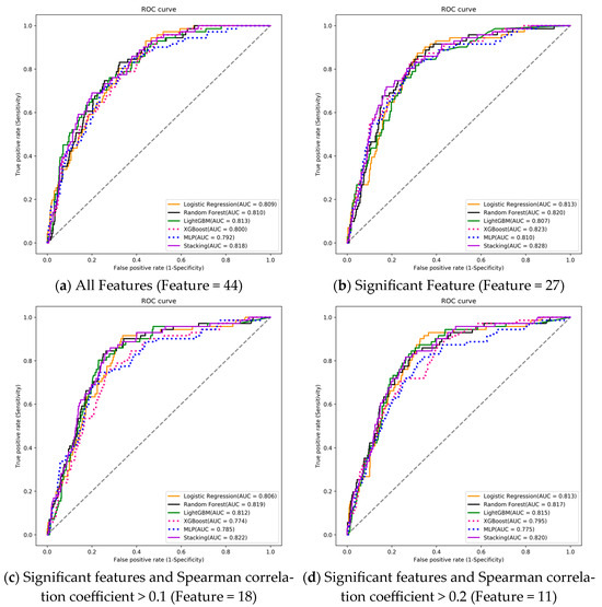 In addition to the five algorithms, we incorporated a Stacking method to compare the performance improvement of an ensemble of all algorithms (as shown in Table 4). While the stacking model slightly outperformed the best single model in terms of AUC, the improvement was marginal. For instance, in the 11-feature combination, the stacking model achieved an AUC of 0.820 compared to 0.817 for the Random Forest model. However, stacking requires substantially more computational resources and training time, due to the integration of multiple base models into a meta-model.