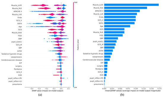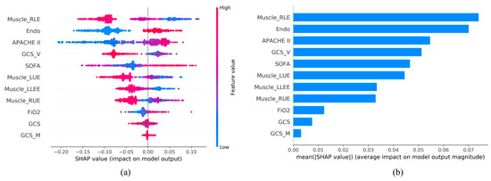 In a Random Forest model with 11 features, the significance order of the features is as follows: Muscle_RLE, Endotracheal intubation, APACHE II score, GCS_V, SOFA score, Muscle_LUE, Muscle_LLE, Muscle_RUE, FiO2, GCS_M, and GCS. This ranking implies that features listed earlier have a greater impact on the model’s predictions. For instance, “Muscle_RLE” holds the highest importance, while “GCS” is considered relatively less important (see Figure 5a,b).