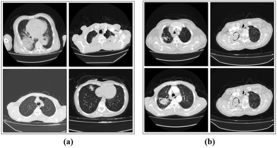 Sample images from the classes/types of the dataset: (a) patients without aspergilloma, and (b) patients with aspergilloma.