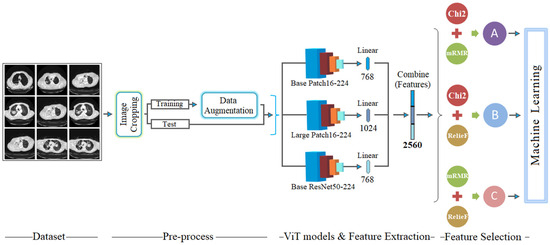 In the pre-processing step, image enhancement and data augmentation processes are performed. Raw data acquired in a hospital environment may have different resolutions. In the pre-processing step, each variable-resolution image is cropped to images with a fixed resolution of 224 × 224. The reason for choosing 224 × 224 resolution is that ViT models process the image at this resolution. Then, due to the limited number of datasets, a data augmentation technique was used. ViT models (basic patch16-224, large patch16-224, and base resnet50-224-in21k) are used in the model-training step. The reason for the variety of ViT models is to enrich the feature sets without relying on a single model. During model training, the data augmentation technique is applied only to the training data (not the test data). This prevents situations like overfitting. The feature sets of the images are extracted before the last layer (linear layer), where the classification process of the three ViT models takes place. In the feature extraction step, the “base”-based ViT models (base patch16-224, and base resnet50-224-in21k) provide 768 features, while the “large”-based model (large patch16-224) provides 1024 features. Then, the features obtained from the three ViT models (768 + 768 + 1024) are combined to obtain a new combined feature set containing 2560 features. The goal here is to enrich the number of features so that the most efficient features can be selected for the next feature selection.