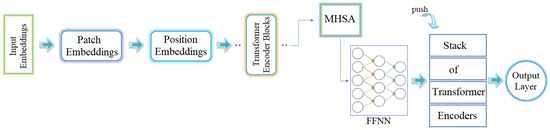 Recent advancements in deep-learning models have significantly contributed to various fields of research. CNNs have made positive contributions to the classification process in autonomous medical image analysis applications. The main drawback of CNN models is that they have not been effective in learning long-range information due to localized receptive fields that limit their capabilities in vision-based processing. ViT models are more effective at transferring long-range information. This is because the concept of attention in image converters works better in ViT models. ViT models are simpler than CNN models in terms of parameter density. However, they can perform better [22,23,24]. The architecture of transformer model consists of six stages [24,25,26]. These process stages are shown in Figure 3.