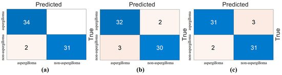 Confusion matrices obtained in the classification process of ViT models: (a) ViT base patch16-224 model, (b) ViT large patch16-224 model, and (c) ViT base resnet50-224-in21k.