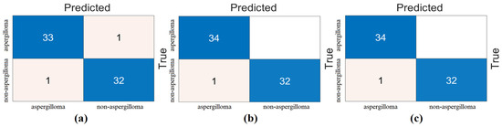 In the fourth step, the best features were selected by feature selection methods with a certain limitation (the selection of the best 40 features or the selection of the best 25 features) and the selections of the feature selection methods were combined and classified by machine-learning methods. In the third step, general success was achieved with 100 features. In this stage, we are looking for an answer to the question of whether 100% overall accuracy can be achieved by at least reducing the number of features. In this step, the number of features was determined by trial and error. We achieved success by selecting the best 40 features from each feature selection method. For example, we combined the best 40 features selected by the Chi2 method with the best 40 features selected by the mRMR method. The total number of features was 79. The reason why the number of features is not 80 is because there are common feature columns between the two feature selection methods (there is an intersection). In this way, there was a fusion between the Chi2 and Relief methods (top 40 features ˅ top 40 features). In the same way, the mRMR and Relief methods were combined (best 40 features ˅ best 40 features). Classification was then performed using machine-learning methods. The best classification success was achieved with the SVM method. The best performance was given by the mRMR and Relief feature set. The mRMR and Relief methods performed best with 79 features and achieved 100% overall accuracy. As a result of this step, we achieved 100% overall accuracy with fewer features. The analysis results of the fourth step are shown in Table 8, and the confusion matrix of the classification analysis performed by combining the feature selection methods is shown in Figure 10. Finally, the proposed hybrid approach for the diagnosis of aspergilloma disease was performed successfully at each step.